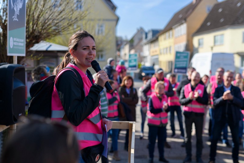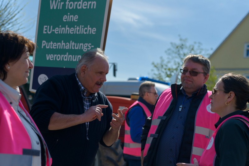 Mit Warnwesten, Transparenten und Trillerpfeifen machten die Landwirte auf ihre Sorgen aufmerksam. Die zentralen Forderungen der Putenhalter fassten u. a. die 1. Vorsitzende des Verbandes Deutscher Putenerzeuger, Bettina Gräfin von Spee und die Putenhalter Caroline Hartmann, Thomas Palm und Giso Eben von Racknitz zusammen. Auch Vertreter der Vermarkter, Brütereien oder Futtermühlen schilderten die möglichen Auswirkungen auf die Branche eindrücklich.
